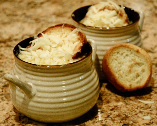 home because sometimes (depending on the recipe) it can turn out to salty, but this recipe from Julia Child’s Cookbook, was simple perfection. Once topped with crusted french bread and fresh melted Gruyere cheese, it became my masterpiece. It also gave me an excuse to use the cute soup bowls from Crate & Barrel that my sister gave me for Christmas.