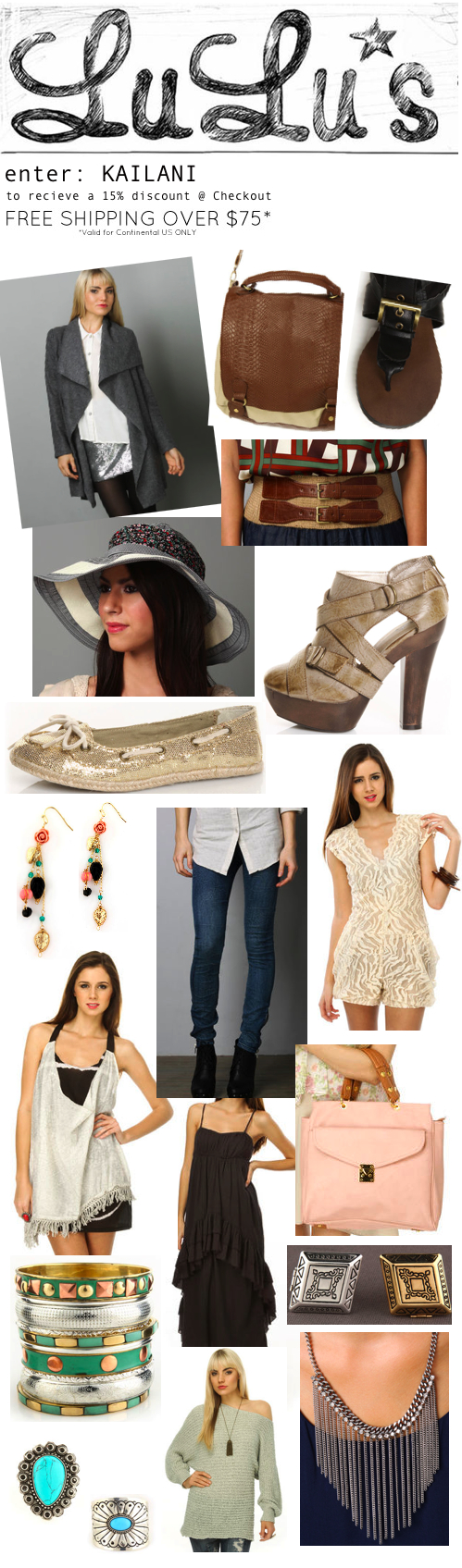 My current craze is with Lulu’s.com. Their clothes, shoes, and accessories are aaamaaazing. So affordable and fashionable, that you will become addicted (like me). BUUUTT… the good thing is that I can save you money for the next few days. If you enter KAILANI (case sensitive, make sure all caps) at the end of your purchase (in the coupon code section) you will recieve a 15% discount at checkout*. Hurry over to Lulu’s.com now offer ends Tuesday March 1,2011.
