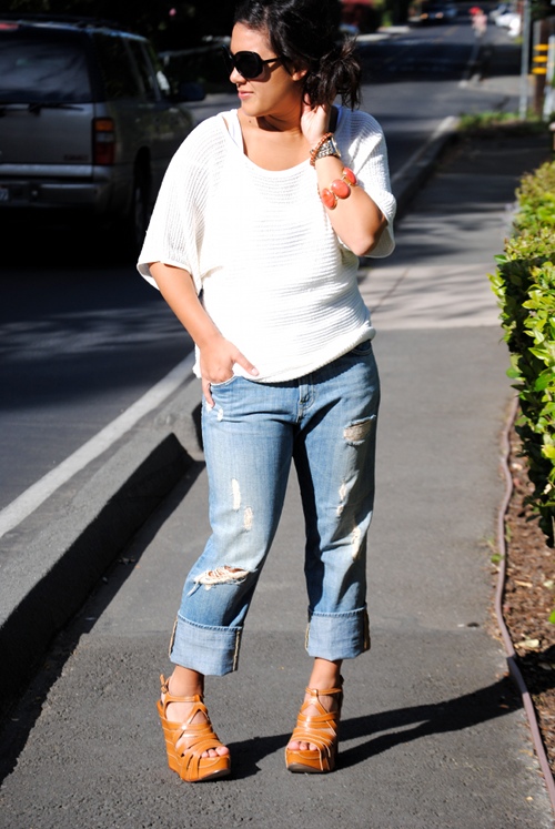 Who doesn’t like just throwing on jeans and a t-shirt some days? I sure as do don’t mind. Although I am not a fan of jeans in general… (probably because I have to hem every pair I buy) I Â must say that I love love love boyfriend jeans they are so comfortable they feel like sweats, which wins big points in my book. You can dress them up & you can dress them down. Since I have short ‘lil legs I paired these jeans with my favorite MIA platforms also seen in this pervious post.